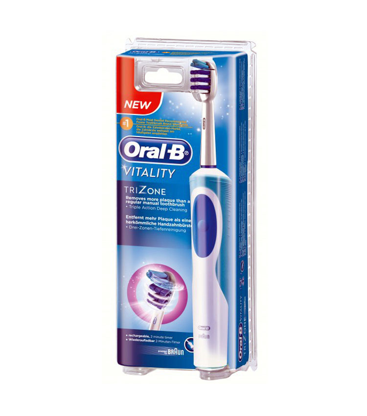 ORAL B VITALITY TRIZONE Spazzolino Elettrico Ricaricabile. Lo spazzolino elettrico Oral-B Vitality TriZone offre eccellente rimozione della placca, la tecnologia di pulizia profonda a tripla azione rimuove molta più placca rispetto a uno spazzolino manuale tradizionale. Timer da due minuti, l’impugnatura pulsa per segnalare il tempo di spazzolamento raccomandato. Le setole ad ampia oscillazione raggiungono una superficie dentale significativamente maggiore rispetto a un comune spazzolino manuale, per garantire una pulizia davvero completa.