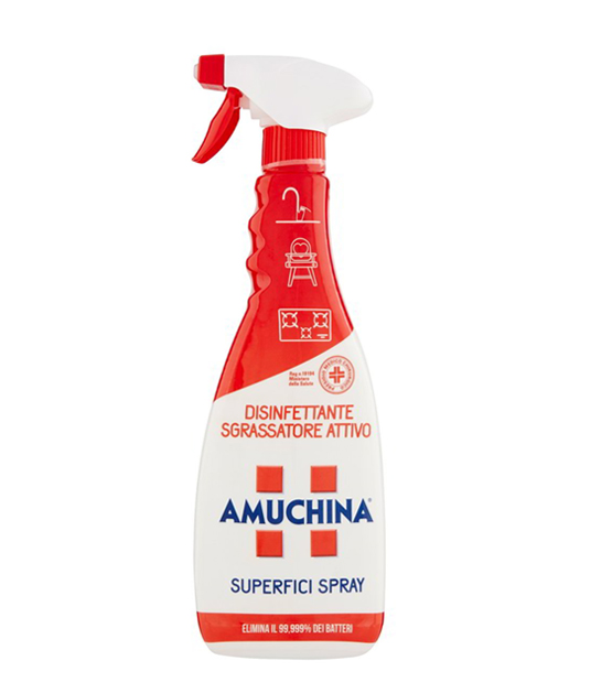 AMUCHINA Superfici Spray Disinfettante Sgrassatore Attivo grazie alla sua formula ad azione sgrassante, permette una disinfezione di tutte le superfici trattate, anche quelle particolarmente unte e caratterizzate dallo sporco più resistente (forni e fornelli, piani di preparazione dei cibi, frigoriferi, ecc.).