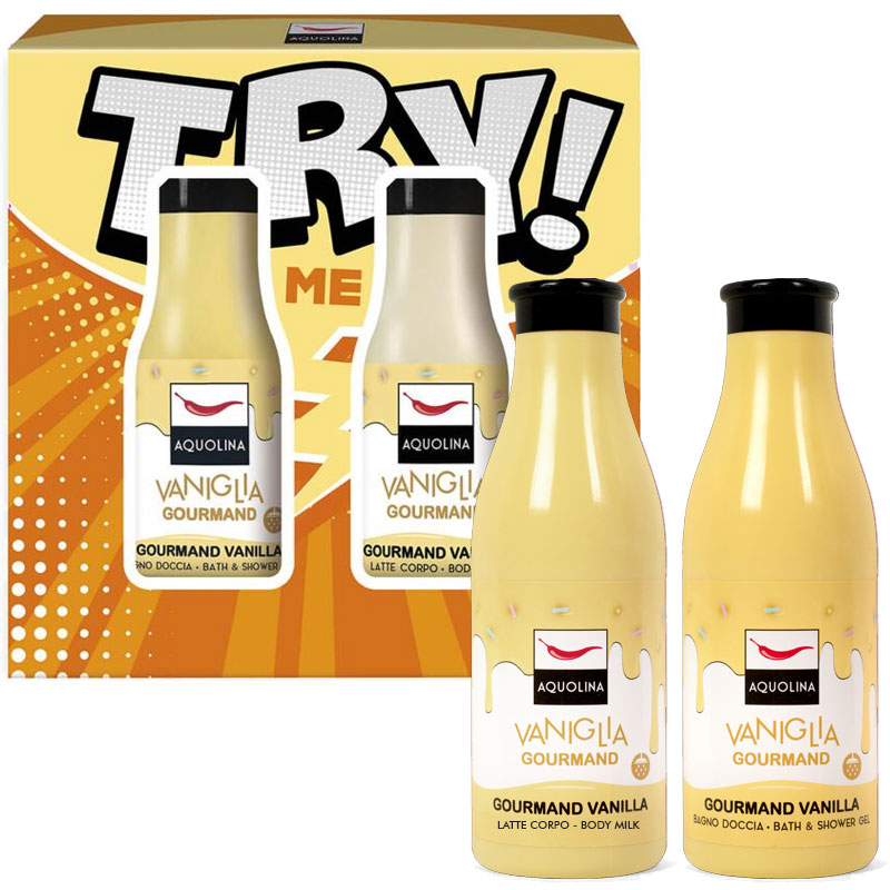 Cofanetto donna AQUOLINA TRY ME VANIGLIA GOURMAND body milk 250ml + bath & shower gel 250ml.