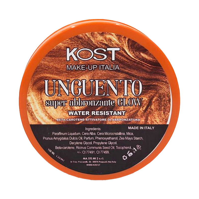 KOST UNGUENTO SUPER ABBRONZANTE, illuminante con beta-carotene, resistente all’acqua, in confezione da 150ml.