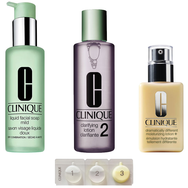 Cofanetto travel/da viaggio CLINIQUE 3 STEP SKIN CARE Programma di Bellezza in 3 fasi, Sapone viso liquido delicato + Lozione esfoliante + Lozione superidratante, in confezioni da 2ml.