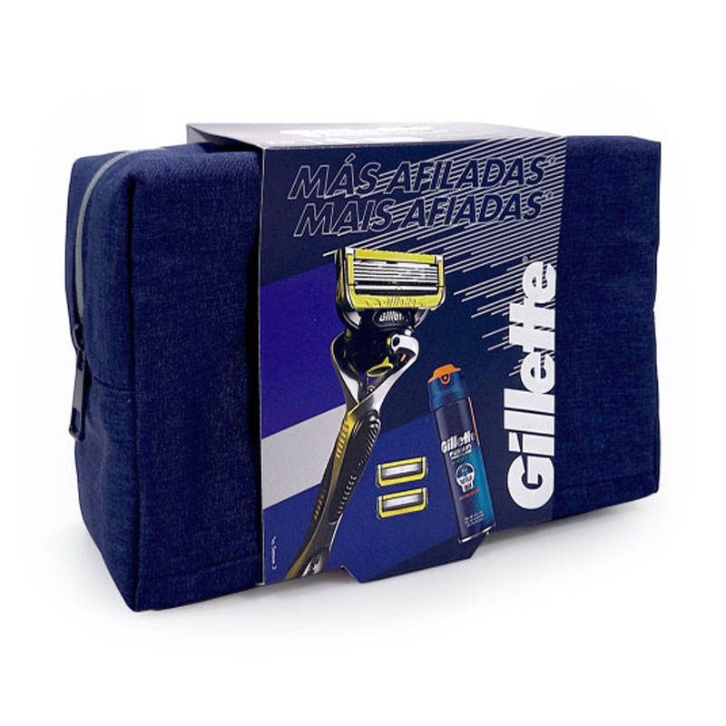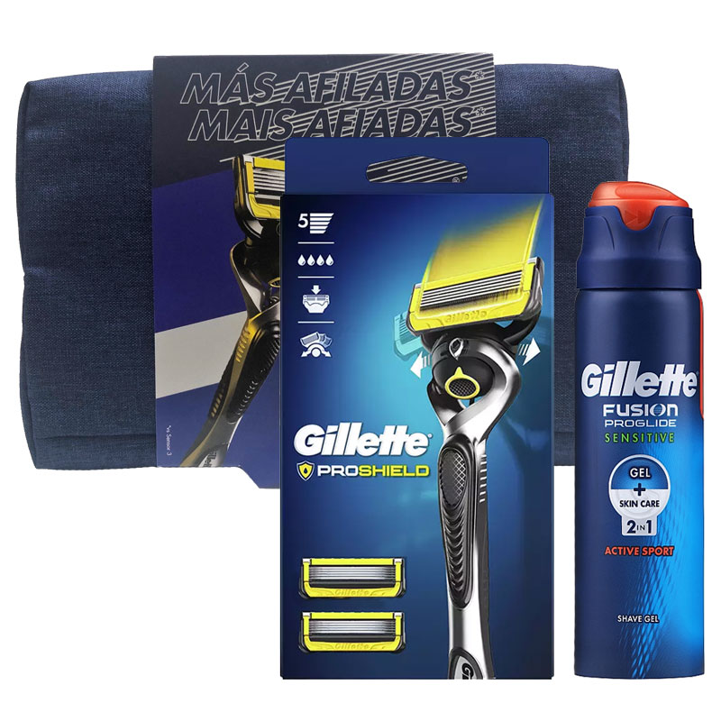 Cofanetto uomo GILLETTE FUSION PROSHIELD Rasoio con lame di ricambio + Gel da barba Proglide Sensitive 170ml + Borsello.