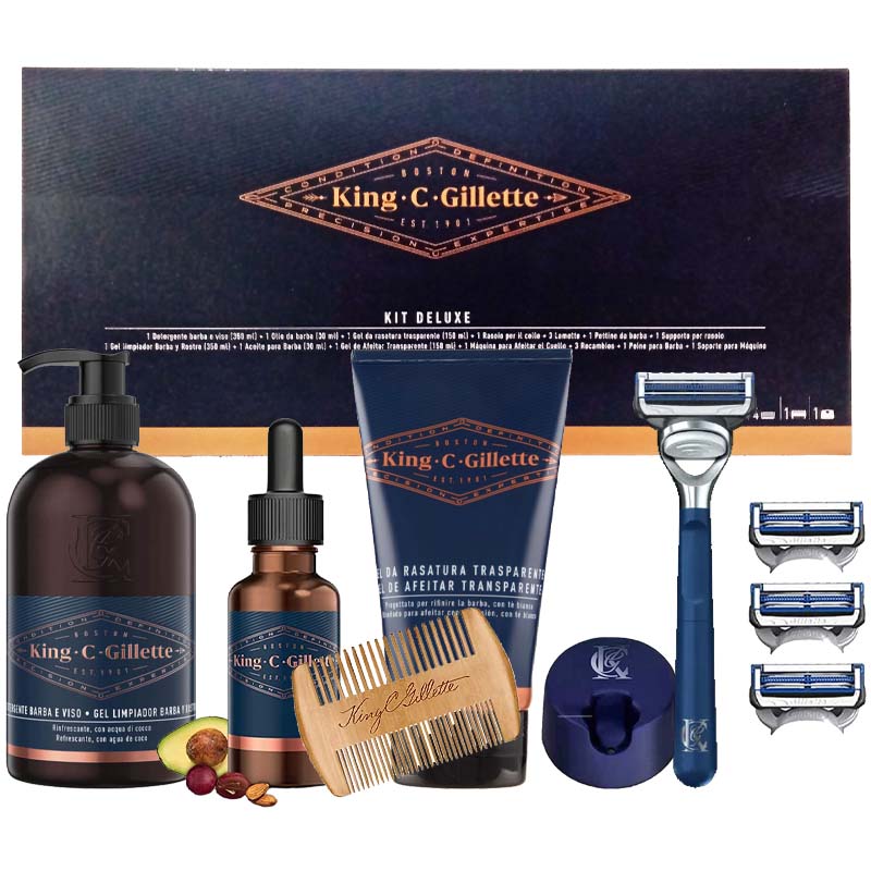 Cofanetto uomo KIT DELUXE KING C GILLETTE detergente barba e viso + olio da barba + gel rasatura + rasoio collo + 4 testine + base rasoio + pettine da barba.