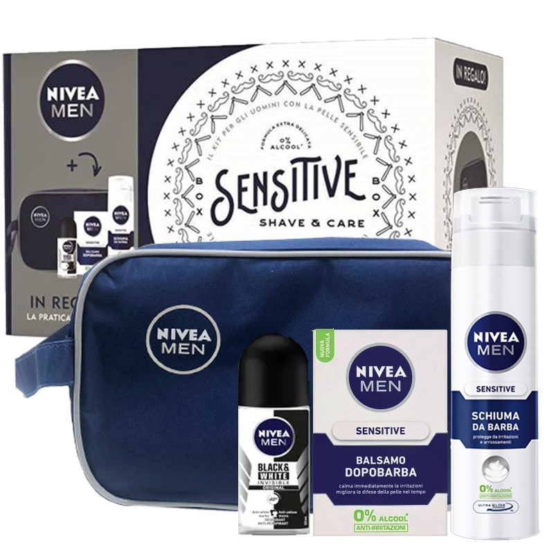 Cofanetto uomo NIVEA MEN SENSITIVE Shave & Care Balsamo dopobarba 100ml + Schiuma da barba 200ml + Deo Roll-On 50ml + man beauty travel.