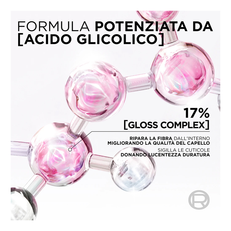 La nuova formula contiene il Gloss Complex, arricchito con Acido Glicolico, per ottenere capelli lucenti e setosi. Grazie al suo pH unico, il nostro Gloss Complex è in grado di penetrare nella fibra capillare e sigillare le cuticole per una lucentezza duratura.