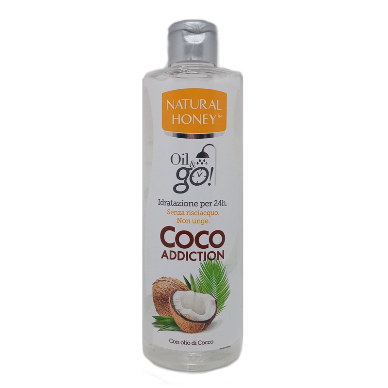 NATURAL HONEY Oil & Go COCO ADDICTION, con olio di cocco, idratante per 24h, da usare sotto la doccia, in confezione da 300ml.