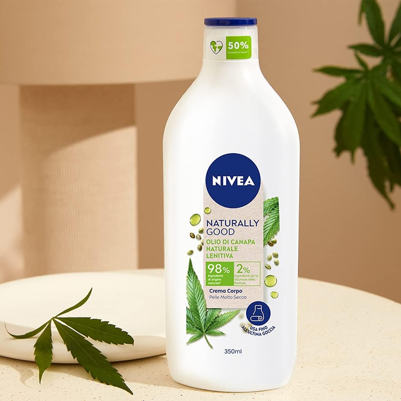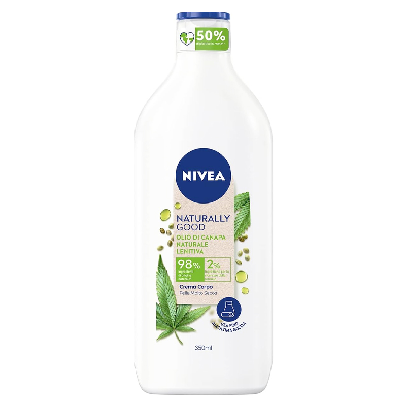 NIVEA NATURALLY GOOD Crema corpo lenitiva per pelle molto secca con olio di canapa naturale, in confezione da 350ml.