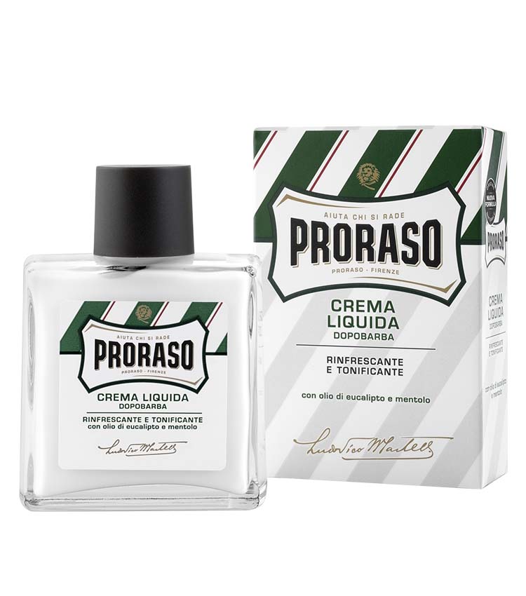 PRORASO Crema Liquida Dopobarba rinfrescante e tonificante con olio di eucalipto e mentolo, in confezione da 100 ml.