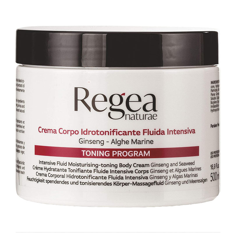 Regea crema corpo idrotonificante: questa crema massaggio ad azione intensiva è ricca di ingredienti attivi idratanti ed elasticizanti come il collagene marino, gli estratti di alghe, l’acido ialuronico, il pantenolo, e gli estratti di ginseng, arnica e the verde.
