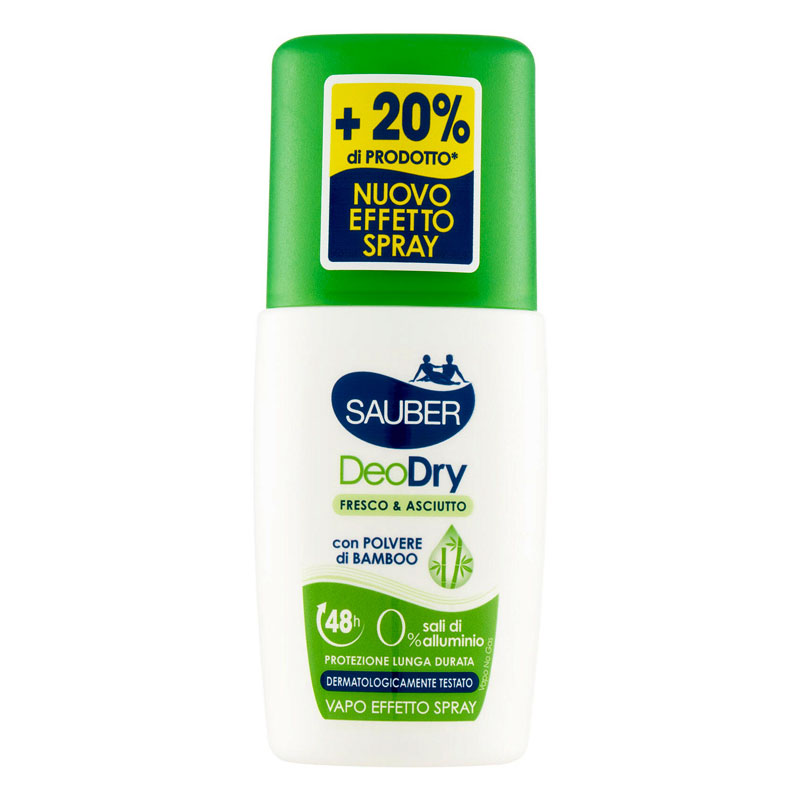 SAUBER DEODRY FRESCO & ASCIUTTO deodorante con polvere di bamboo, vapo no gas, in confezione da 90ml.