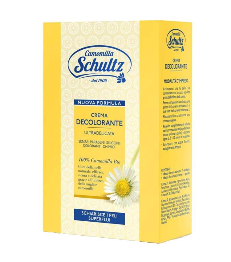 La crema decolorante Schultz schiarisce in maniera delicata i peli superflui del viso o delle altre parti del corpo, rendendoli invisibili. La sua formula con estratto biologico di camomilla senza conservanti la rende particolarmente adatta alle pelli più delicate. Caratteristica principale della camomilla è infatti l’estrema tollerabilità cutanea, per questo la crema decolorante Schultz garantisce un risultato perfetto e naturale nel pieno rispetto dell’equilibrio della pelle.