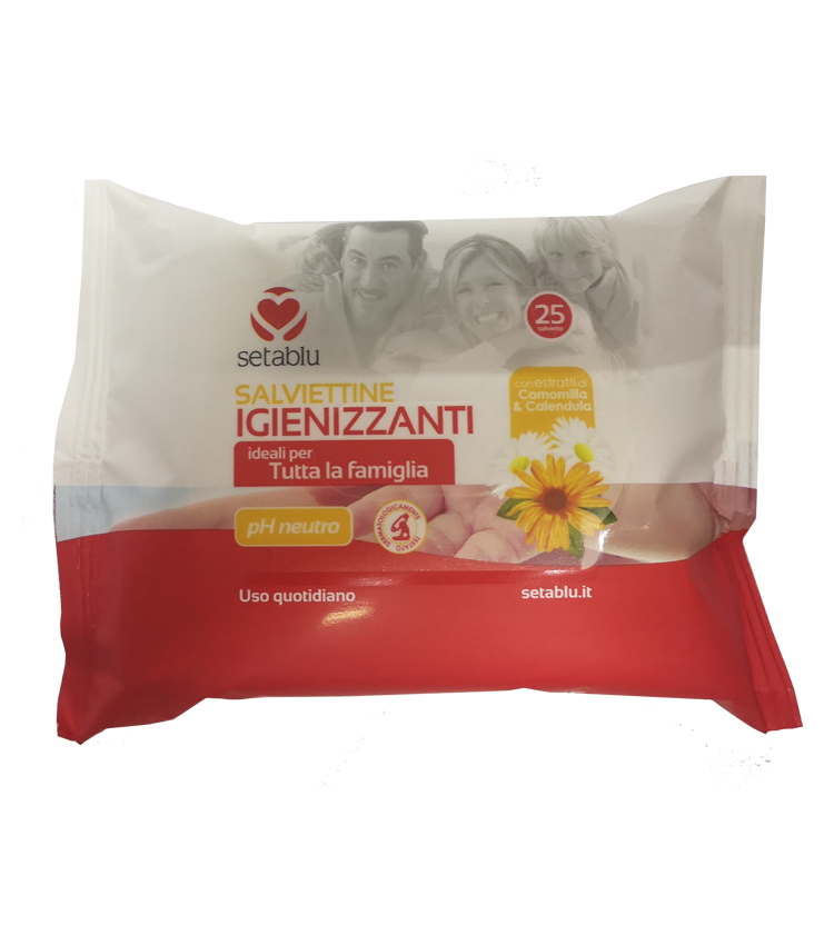 Salviettine SETABLU IGIENIZZANTI pH Neutro con estratti di Camomilla e Calendula, confezione da 25 salviette.