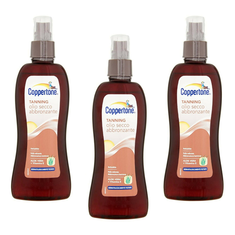 Stock 3 pezzi, COPPERTONE TANNING Olio Secco Abbronzante anti-sabbia, con Aloe Vera e vitamina E, in confezione da 200ml.