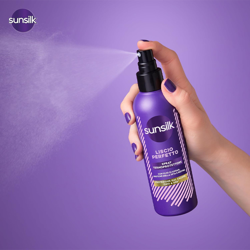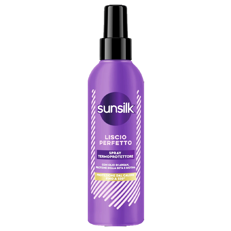 SUNSILK Liscio perfetto spray termoprotettore con olio di Argan & proteine della seta, in confezione da 200ml.